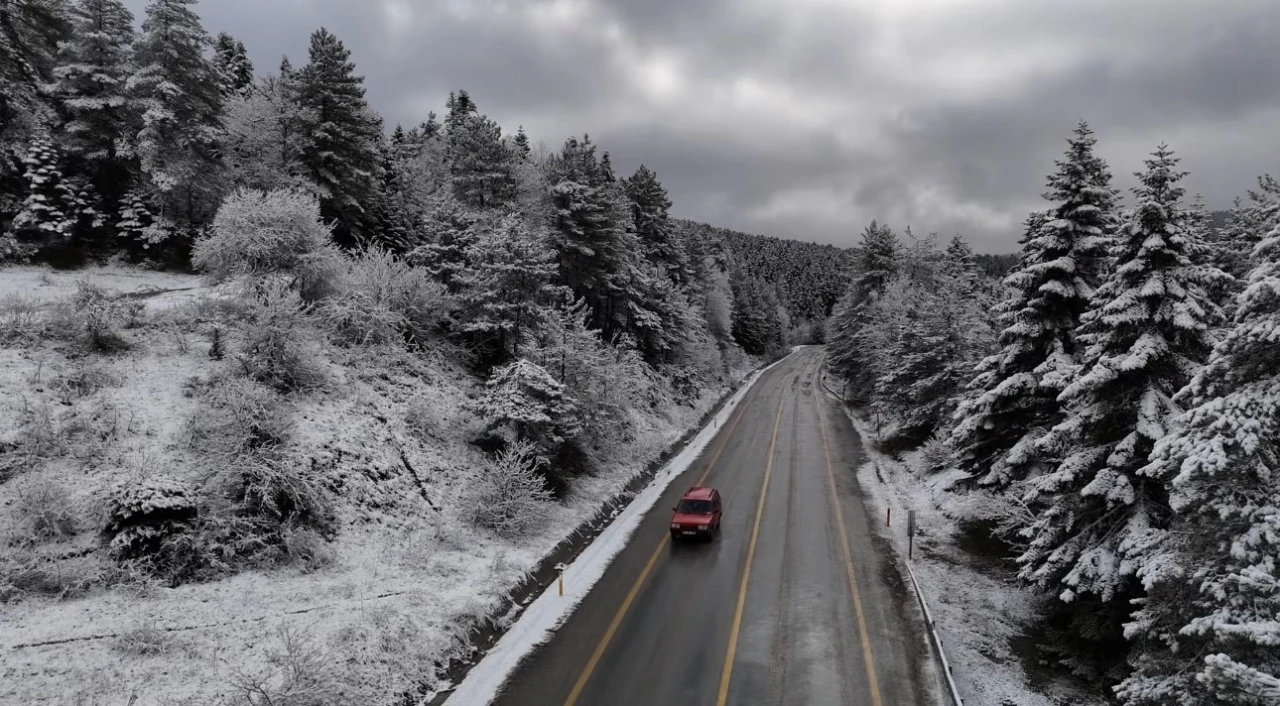 Karabük’ün yüksek kesimlerinde etkili olan kar yağışıyla birlikte ormanlık alanlar beyaza bürünürken, ortaya çıkan kartpostallık manzaralar dronla görüntülendi.
