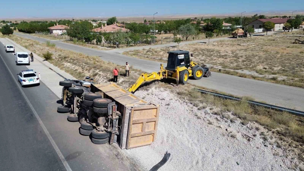 Karaman’da kontrolden çıkan mıcır yüklü kamyonun yol kenarına devrilmesi sonucu sürücüsü yaralandı.