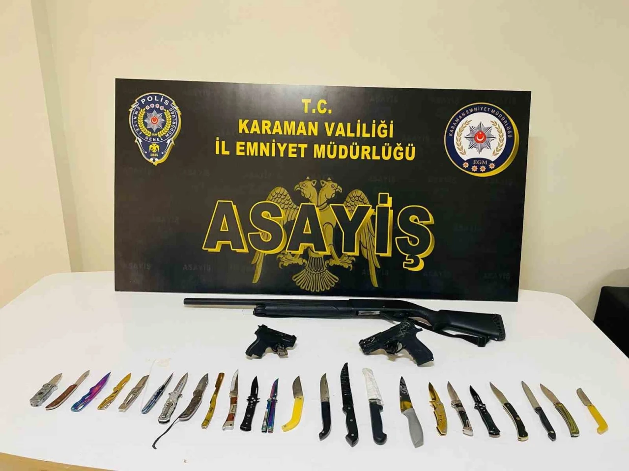 Karaman’da polisin yaptığı asayiş uygulamalarında uyuşturucu, kaçak tütün ve ruhsatsız silahlar ele geçirilirken, çeşitli suçlardan aranan 7 şahıs tutuklandı.