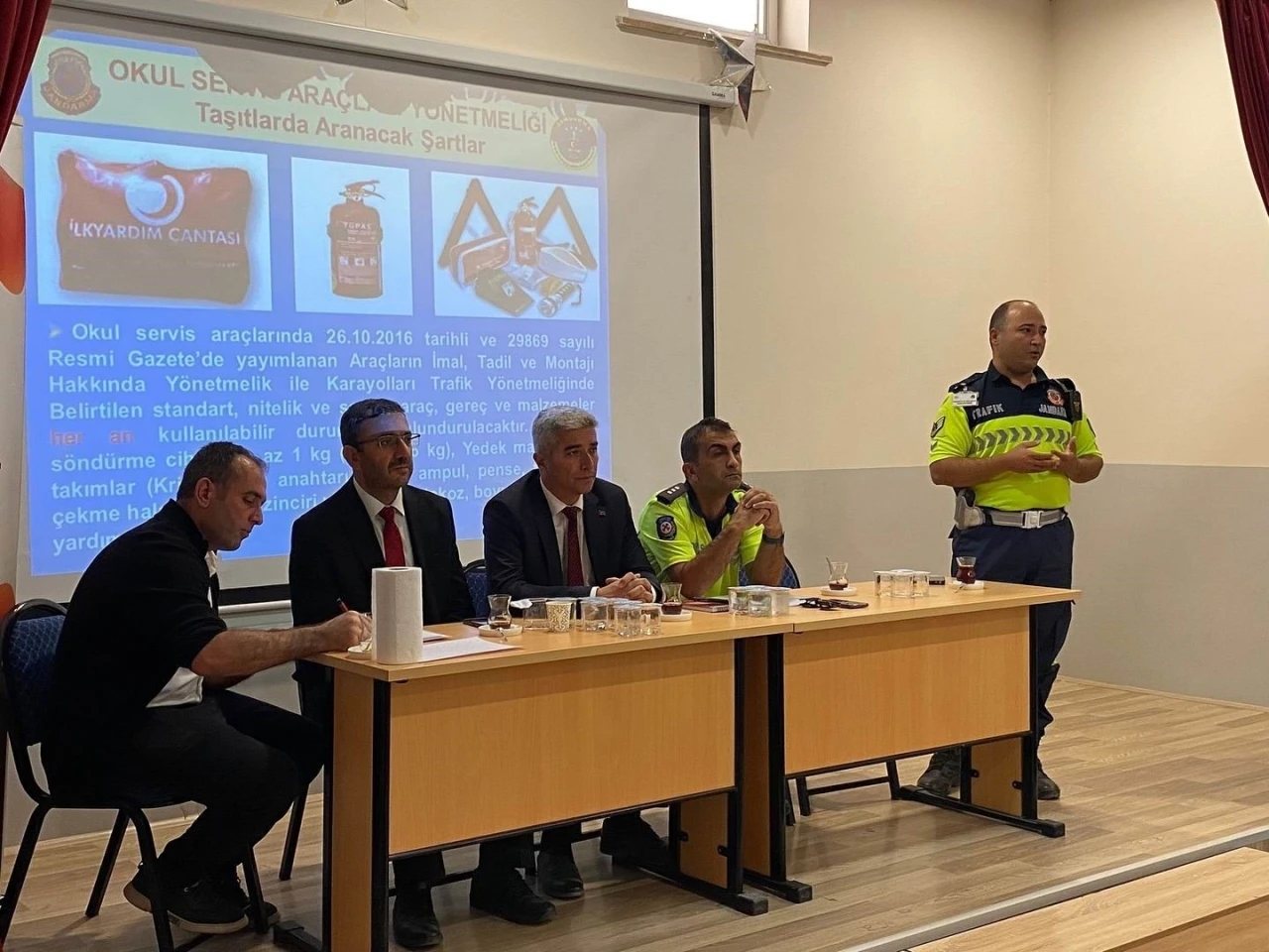 Toplantıda, taşımalı eğitim sisteminde görev alan sürücüler ve rehber personellerin görev ve sorumlulukları, uymaları gereken trafik kuralları, öğrenci taşıma güvenliği, araçların bakım ve kontrolleri gibi konularda kapsamlı bilgilendirmeler yapıldı. Ayrıca, yeni eğitim öğretim yılında yaşanabilecek muhtemel sorunların önlenmesi için alınacak tedbirler ve izlenecek yöntemler üzerinde duruldu. İlçe Jandarma Trafik Komutanlığı ve Bölge Trafik Denetleme ekipleri tarafından sürücülere yönelik trafik güvenliği, hız kontrolü, emniyet kemeri kullanımı, okul servis araçlarının taşıma standartları gibi konularda sunumlar yapılarak dikkat edilmesi gereken hususlar aktarıldı.