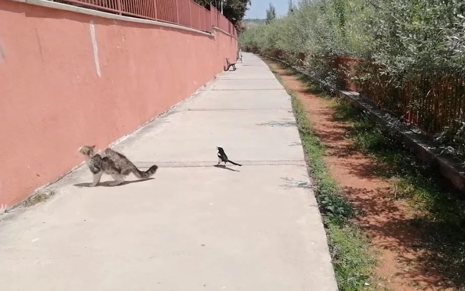 Sivas’ın Zara ilçesinde bir karga, ağaç gölgesinde serinlemek isteyen kediyi gördü. Bir süre kedinin çevresinde gezinen karga, kedi ile oynamaya başladı. Gagası ile kediyi ısırmaya başlayan karga, kediyi rahatsız etti. Gölgede uzanan kedi ile bir süre uğraşan karga, kedinin bölgeden uzaklaşmasını sağladı. Karganın yaptığı hareket, çizgi film sahnelerini aratmadı.