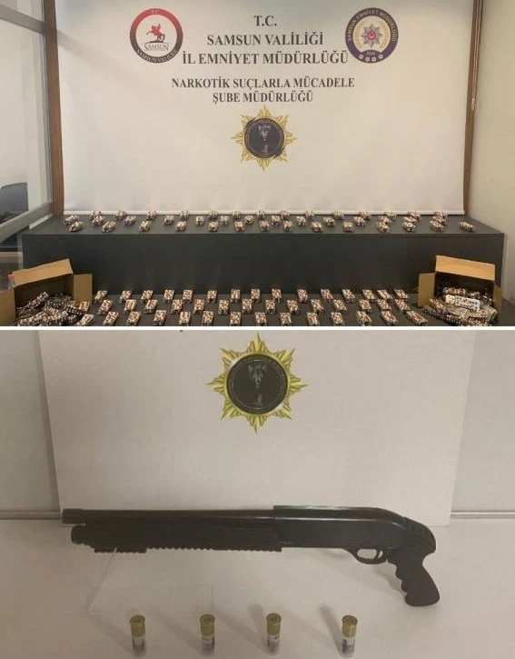 Edinilen bilgiye göre, Samsun Cumhuriyet Başsavcılığı koordinesinde uyuşturucu ile mücadele kapsamında çalışma yapan Samsun Emniyet Müdürlüğü Narkotik Suçlarla Mücadele Şube Müdürlüğü ekipleri, Canik ilçesi Yenimahalle’de S.Ç. ve E.K. isimli şahısları kargodan paket aldıktan sonra suçüstü yakaladı. Şahısların kargo paketlerinde ve ikametlerinde yapılan aramada 7 bin 840 kapsül sentetik ecza, 1 adet pompalı tüfek ve 4 adet tüfek kartuşu ele geçirildi.