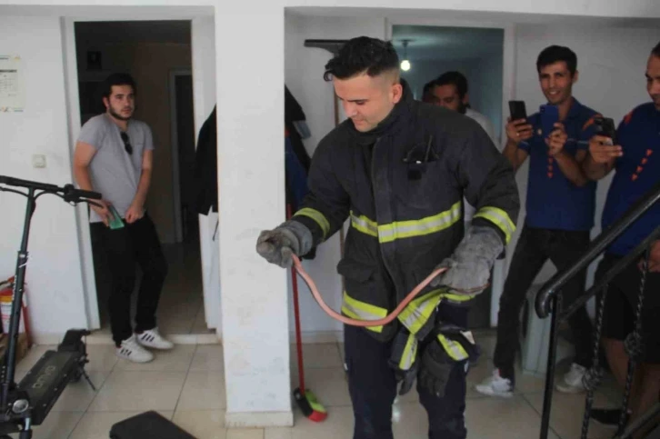 Olay, saat 12.45 sırasında Muratpaşa ilçesi Topçular Mahallesi Aspendos Bulvarı üzerindeki bir kargo firmasının şubesinde yaşandı. Mutfağa su almaya giren çalışanlar, yaklaşık 1 metre uzunluğunda siyah bir yılanın içeride olduğunu gördü. Diğer personelle birlikte yılan çıkarılmaya çalışılsa da başarılı olunamadı. Yılan mutfak tezgahının arkasında gizlenince durum 112 Acil Çağrı Merkezi’ne bildirildi. İhbarla adrese gelen itfaiye ekibi, eldivenini takıp, yılan yakalama aparatını alarak mutfağa girdi. Ekip, yaptığı aramaya rağmen yılanı göremedi. Bir çalışanın yılanın saklandığı yeri göstermesi üzerine ekip, o noktaya doğru aparatı uzattı. Bir anda bulunduğu yerden çıkan yılanın zarar görmemesi için fırçayla üzerine baskı yapıldı. İtfaiye eri, yılanın önce kafasından sonra kuyruğundan tutup yakaladı. Mutfaktan çıkarılan yılan fileye alındı ve doğaya bırakıldı. "Korktuk"