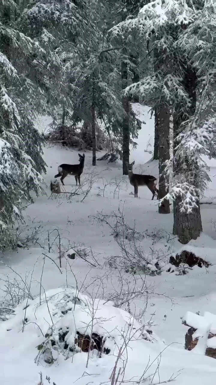 Karabük’ün Safranbolu ilçesinde karla kaplı ormanda anne karaca ve 2 yavrusu cep telefonuyla görüntülendi.
