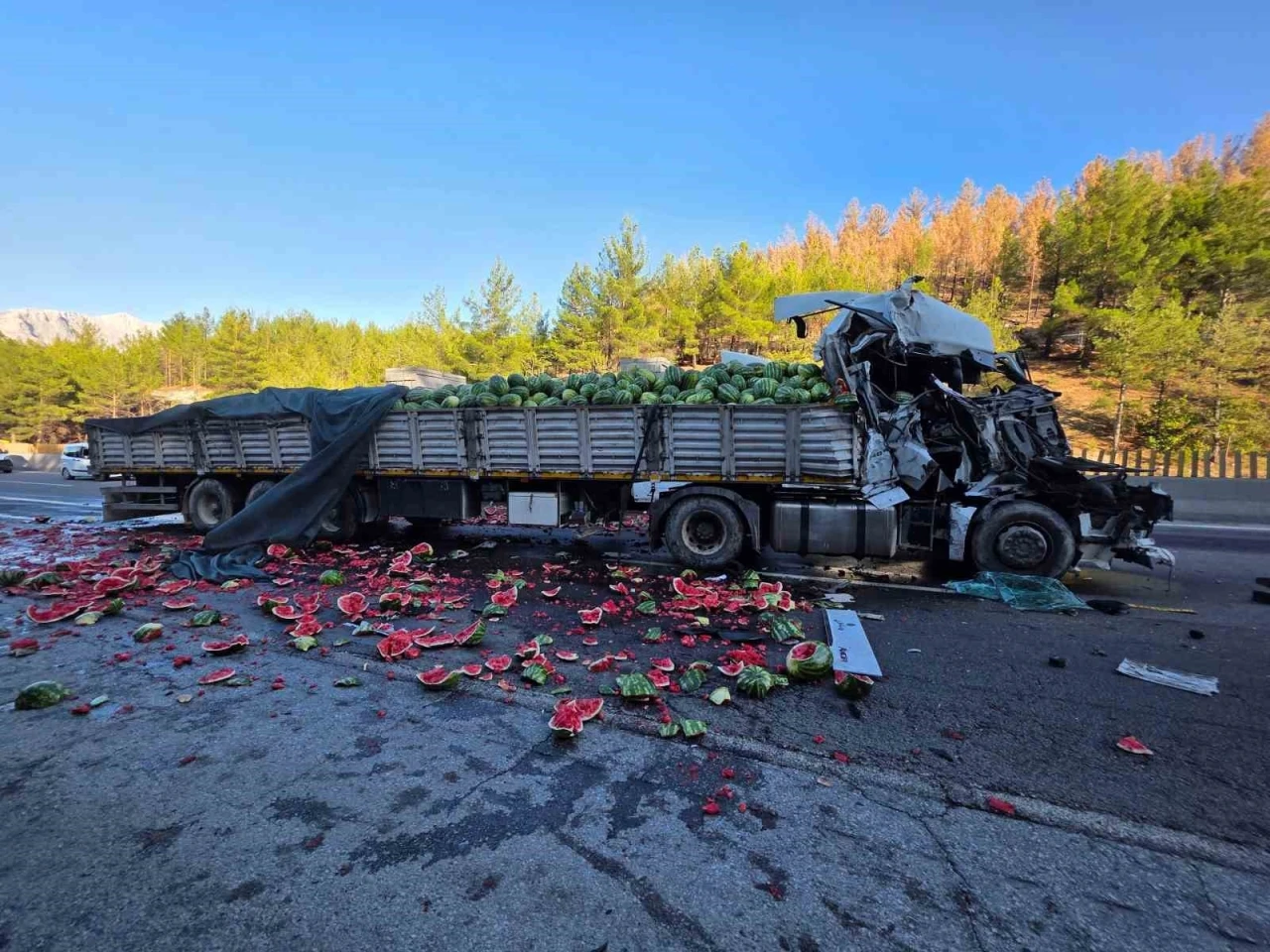 Adana-Pozantı otoyolunda karpuz yüklü tır başka bir tıra arkadan çarparak devrildi. Karpuzlar otoyola saçıldı.