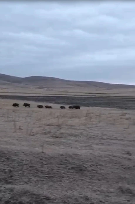 Kars’ta havaların soğumasıyla birlikte yiyecek bulmakta zorlanan domuz sürüsü köye kadar indi. Bir anda domuz sürüsünü karşısında gören vatandaşın domuz sürüsüyle diyalogu cep telefonuyla kaydedildi.
