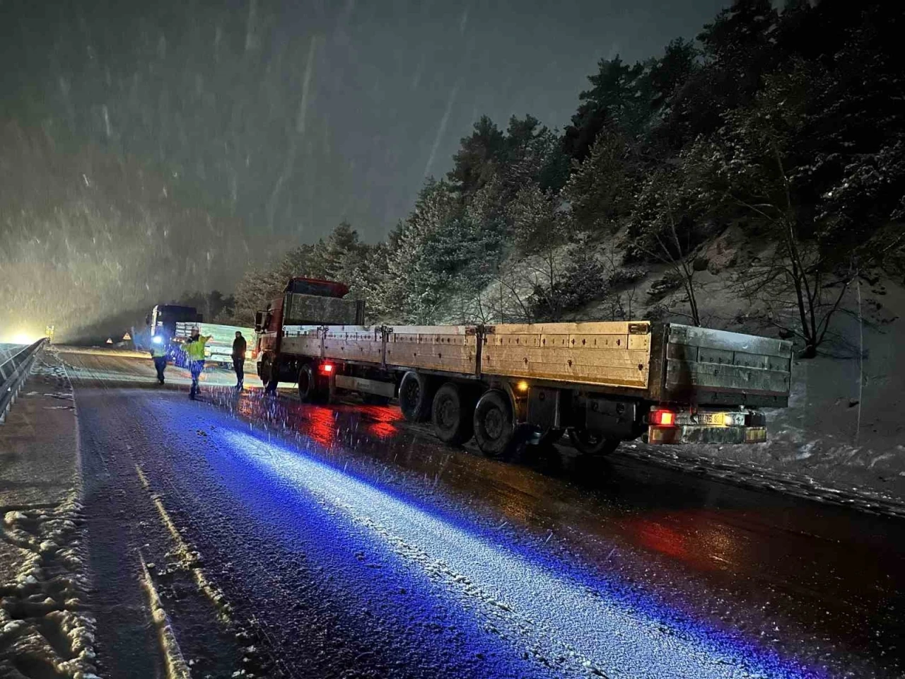 Kastamonu’da etkili olan yoğun kar yağışına hazırlıksız yakalanan sürücüler yolda mahsur kaldı. Yolda kalan araçlar sebebiyle uzun araç kuyruğu oluştu.