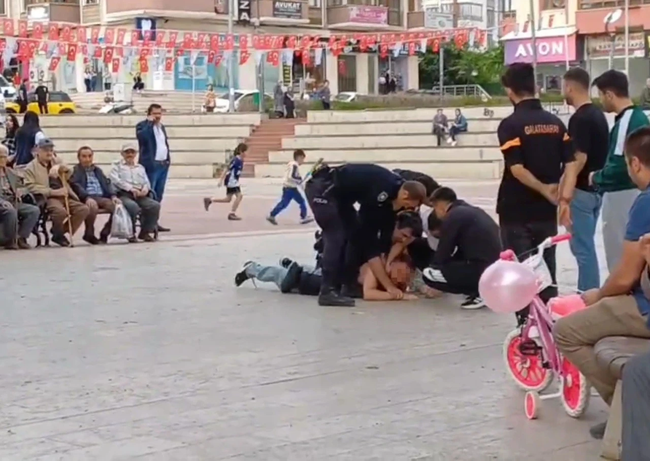 Olay, Misak-ı Milli Meydanında meydana geldi. İki kişi arasında henüz bilinmeyen bir nedenle kavga çıktı. Polis ekiplerinin araya girmesine rağmen karşısındakine saldırmaya çalışan şahıs yediği yumrukla yere yığıldı. Güçlükle kontrol altına alınan şahsın, polis ekiplerine yaşattığı zor anlar cep telefonu kamerası tarafından görüntülendi.