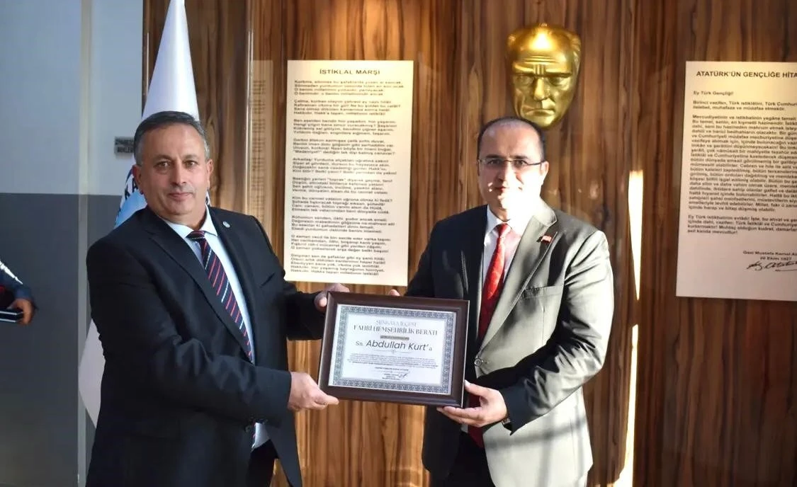 Başkan Vekili Özer, İlçe Kaymakamı Abdullah Kurt’a Fahri Hemşehrilik Beratı takdim etti.