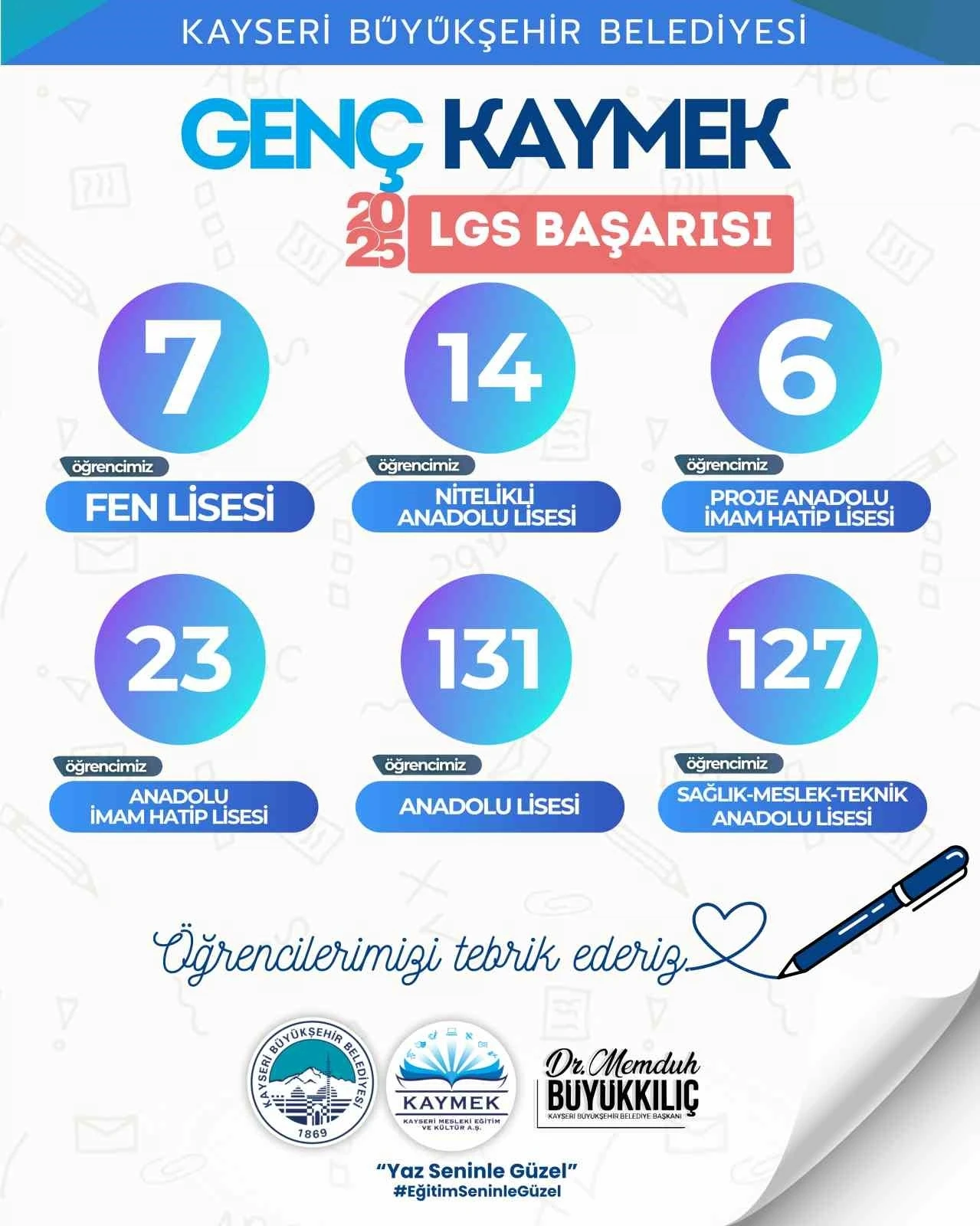Kayseri Büyükşehir Belediyesi bünyesinde faaliyet gösteren KAYMEK; ücretsiz LGS hazırlık kursunda eğitim gören öğrencilerinden 7’sini Fen Liselerine, 14’ünü Nitelikli Anadolu Liselerine, 6’sını Proje Anadolu İmam Hatip Liselerine, 23’ünü Anadolu İmam-Hatip Liselerine, 131’ini Anadolu Liselerine ve 127’sini de Sağlık-Meslek-Teknik Anadolu Liselerine yerleştirme başarısı gösterdi.