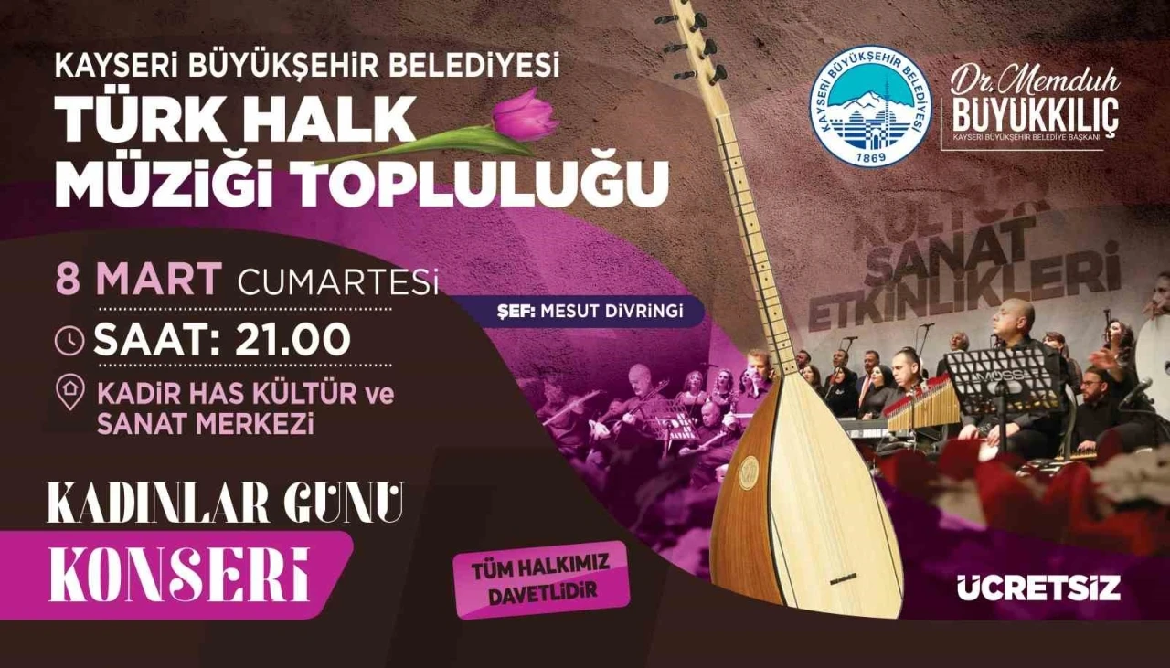 Kayseri Büyükşehir Belediyesi Türk Halk Müziği Topluluğu 8 Mart Dünya Kadınlar Günü dolayısıyla konser düzenliyor. Büyükşehir Belediyesi, 8 Mart Cumartesi günü Kadir Has Kültür ve Sanat Merkezi’nde saat 21.00’de gerçekleştireceği Kadınlar Günü Konseri ile ücretsiz bir şekilde Kayserililere müzik ziyafeti sunacak.