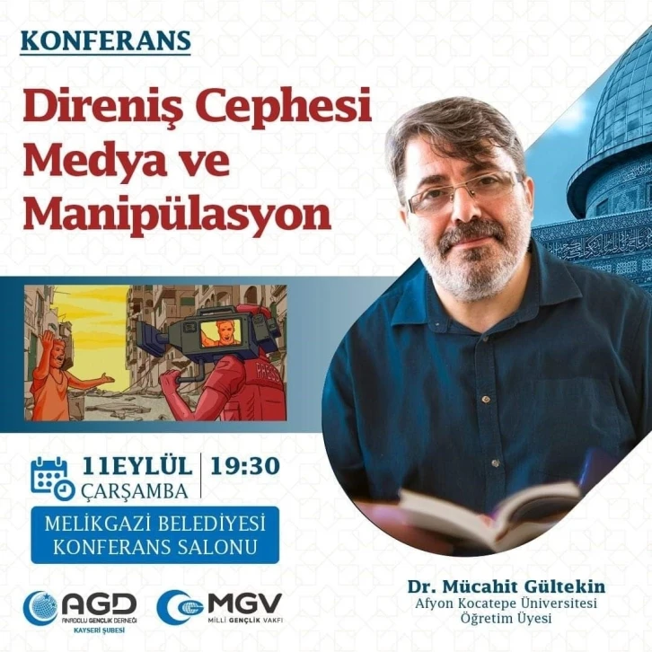 Anadolu Gençlik Derneği (AGD) Kayseri Şubesi tarafından düzenlenen "Direniş Cephesi, Medya ve Manipülasyon" başlıklı konferans, bugün gerçekleştirilecek.