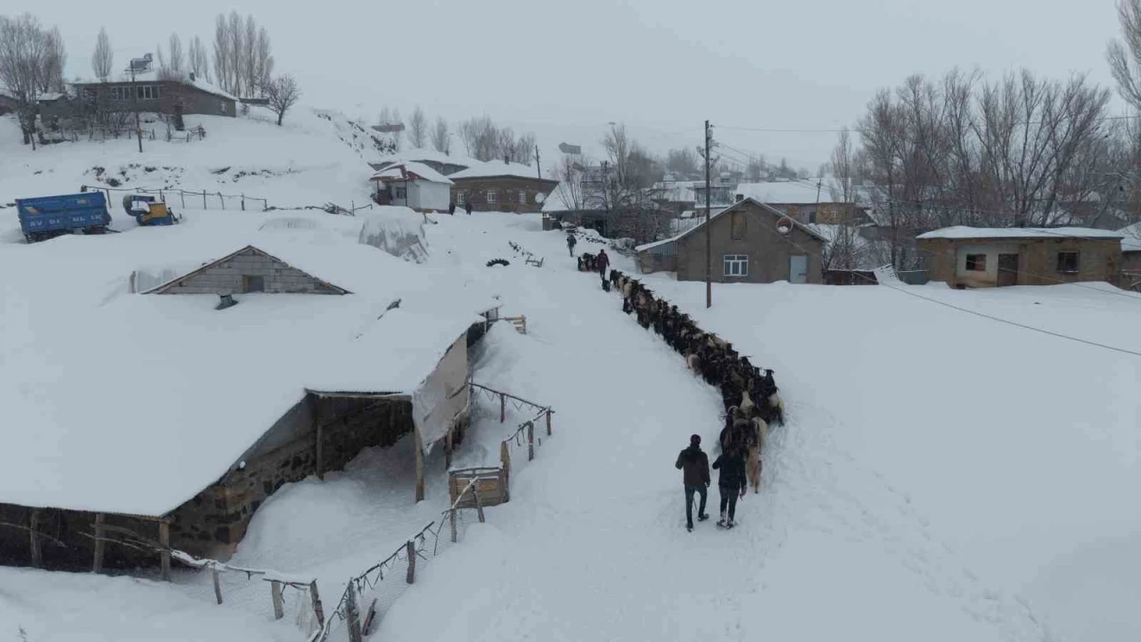 Muş’ta etkisini sürdüren yoğun kar yağışı ve tipi, özellikle yüksek rakımlı bölgelerde hayvancılıkla geçimini sağlayan üreticilerin yaşamını olumsuz etkiliyor. Merkeze 56 kilometre uzaklıkta, bin 800 rakımda bulunan Yukarıyongalı köyüne bağlı Behçet mezrasındaki keçi sürüsünün, yemlerin tükenmesi üzerine köye geri getirildi.