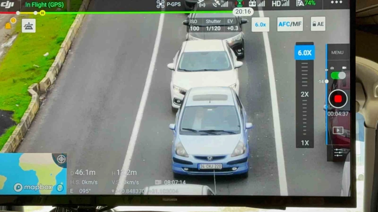 DÜZCE (İHA) – Düzce’de bölge trafik ekipleri dron destekli denetim yapıldı. Kemer takmayan, direksiyon başında telefonla konuşan ve emniyet şeridi ihlali yapan sürücülere ilgili maddelerden idari para cezası uygulandı.