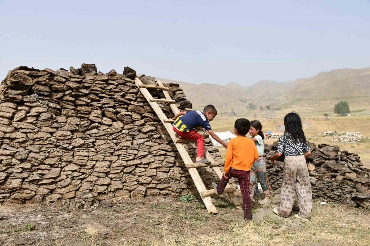 Şırnak’ta yaylaya çıkan göçerler kış hazırlıklarına başladı. Ailelerine yardım eden çocuklar da tezekleri kurutup topluyor.