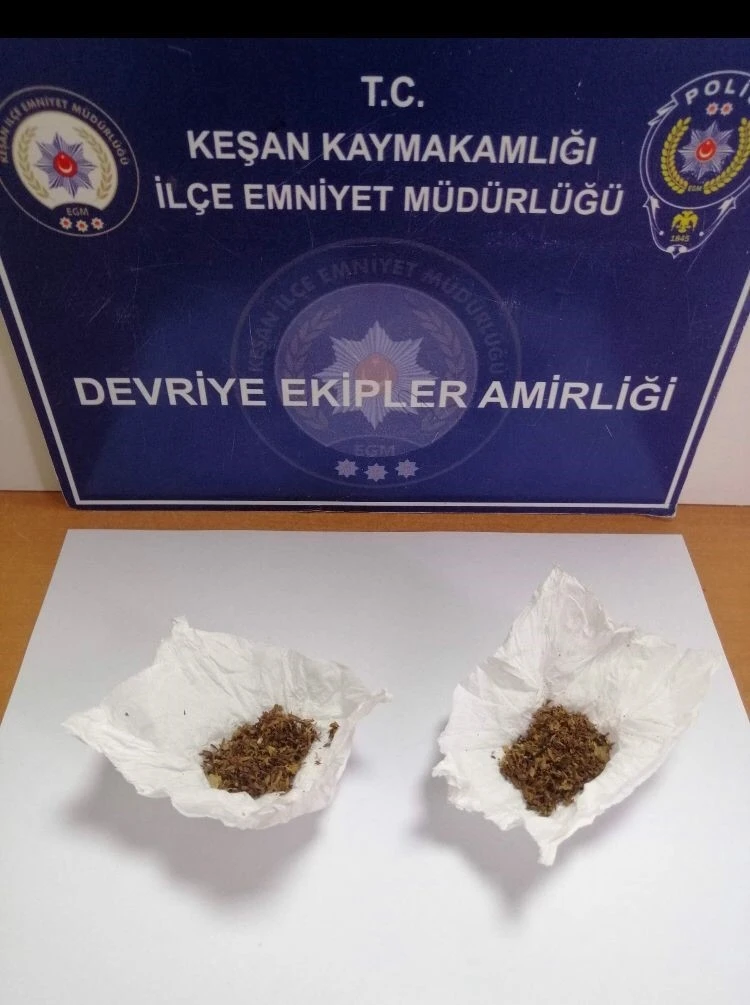 Alınan bilgiye göre; Keşan İlçe Emniyet Müdürlüğü ekipleri, Yörük Mahallesi Kayalıdere Sokak’ta durumundan şüphelendikleri F.V.’yi durdurdu. Üst araması yapılan şüpheliden, 2 adet peçete içerisinde 3,32 gram kimyasala bulanmış tütün olarak tabir edilen uyuşturucu ele geçirildi. Gözaltına alınan şüpheli hakkında adli işlem başlatıldı.