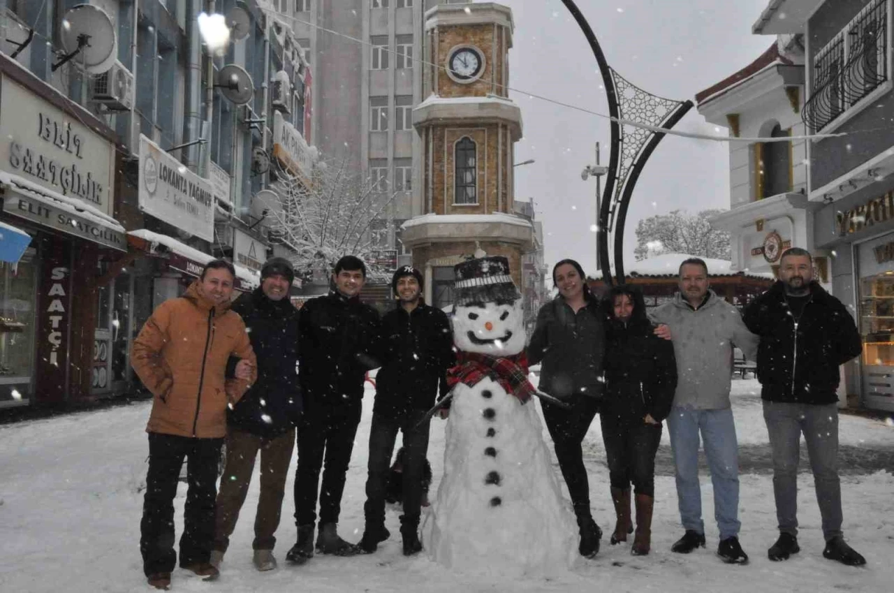 Edirne’nin Keşan ilçesinde yeniden etkili olan kar yağışı nedeniyle esnaf, aileleriyle birlikte iş yerlerinin önünde kardan adam yapıp kar yağışının tadını çıkardı. İlçeye bağlı bazı köylerde kapanan yolların açılması için çalışma yapıldı.
