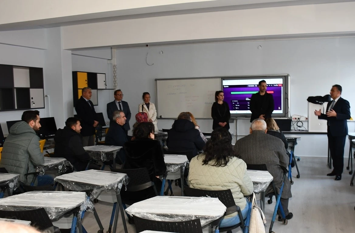 Okul ziyaretine Bilgi İşlem ve Eğitim Teknolojileri Şube Müdürü Ali Güder, Ortaöğretim Şube Müdürü Nilgün Seçen ve Bilişim Teknolojileri İl Koordinatörü Derya Tanrıkulu eşlik etti.