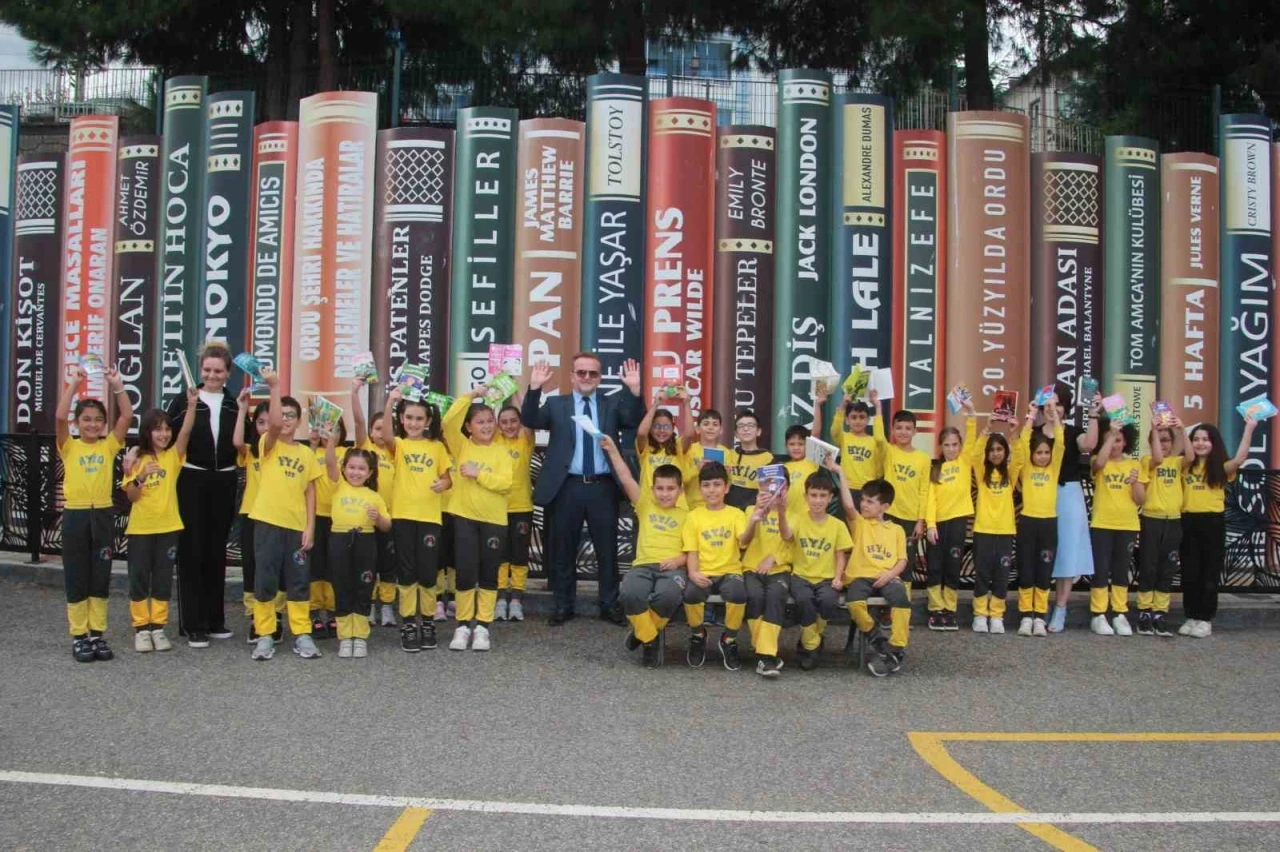Ordu’daki bir ilkokulun bahçesinde bulunan istinat duvarlarındaki kitaplık dekoru, öğrencileri kitap okumaya teşvik ediyor. Kütüphane dekoru önünde kitap okuma etkinlikleri de düzenleniyor.