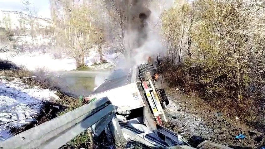 Devrilmenin etkisiyle tırın ön kısmında yangın çıktı. Kazayı gören çevredeki vatandaşların ihbarı üzerine olay yerine sağlık, jandarma ve itfaiye ekipleri hızla sevk edildi. İtfaiye ekipleri, alevlere müdahale ederek yangını kısa sürede kontrol altına almayı başardı. Ancak, tır sürücüsü Muhammet Emin Tunç, feci kaza yerinde hayatını kaybettiği belirlendi.