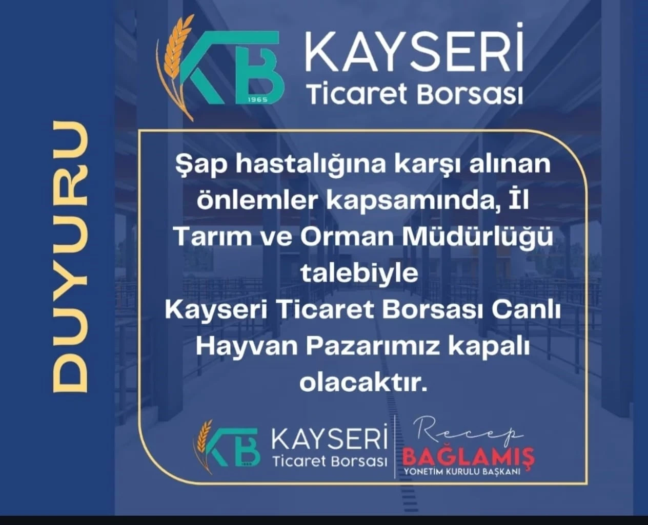 Kayseri Ticaret Borsası’nın (KTB) sosyal medya hesabından yapılan paylaşım ile KTB Canlı Hayvan Pazarı’nın şap hastalığı önlemleri dolayısıyla kapalı olacağı duyuruldu.