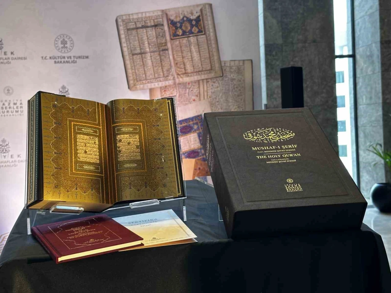 Burada konuşan Bakan Ersoy, en gelişmiş baskı tekniklerini kullandıklarını ifade ederek, "Şevki Efendi, hat tarihçilerimiz ve büyük hattatlarımız tarafından Osmanlı hat sanatında, sülüs ve nesih hatlarının zirvesi kabul edilmektedir. Bu büyük usta aynı zamanda Mushaf yazımında kendisinden sonraki hattatları derinden etkilemiş, günümüzde ise Mushaf yazımında hattatların tamamının takip ettiği yegane üslubun sahibi haline gelmiştir. Biz, Şevki Efendi’nin yazmış olduğu 25 Mushaf arasından 1878’de yazdığı Mushaf’ı seçerek basımını yaptık. Zira bu Mushaf alanın uzmanları tarafından mükemmelliğe örnek gösterilmekte; büyük sanatkarın nesih hattında ve hat tarihindeki konumunun şahidi olarak değerlendirilmektedir. Sultan Mehmed Reşat tarafından şehzadeliğinde hocasına yazdırdığı Mushaf’ın müzehhibi ise yine dönemin önde gelen sanatkarlarından Hüseyin Hüsnü Efendi’dir. Bizler, Şevki Efendi gibi sahasında çığır açan bir sanatkarımızın, bir tane eserinin dahi basılmamış olmasını ciddi bir eksiklik olarak gördük ve bunu gidermek adına çalışmalarımızı başlattık. Bu sadece bizim değil, hemen her hattatın ve önde gelen hat uzmanlarının bir beklentisi, arzusuydu. Öyle ki TÜYEK Yazma Mushaflar Dairesi Başkanlığımız tarafından Şevki Efendi Mushafı’nın basılacağı haberi ciddi bir heyecan vesilesi olmuş; aldığımız geri dönüşler, duyulan memnuniyet bizlerin de şevkini ve gayretini beslemiştir. Çalışmamızın her aşamasında son kararın, Mushaf’ı yayına hazırlayan ve günümüzde hat sanatımızın dünyadaki en önde gelen temsilcilerinden olan Mehmet Özçay tarafından verildiğini burada vurgulamak isterim. Zira bu çalışmanın sancaktarı da odur. Hocamız, 2013’ün ocak ayında Topkapı Sarayı’nda bir hafta boyunca tarama yaparak bu yolu açmış, bugüne ulaşana kadar her menzilde emek sarfetmiştir. Çok şükür ehil ellerin bu emeğini, bu hasretini vuslata dönüştürmek bugüne nasip olmuştur" dedi. "Bu çalışma aynı zamanda TÜYEK Yazma Mushaflar Dairesi Başkanlığımızın neşrettiği ilk eser olarak da tarihe geçmiştir"