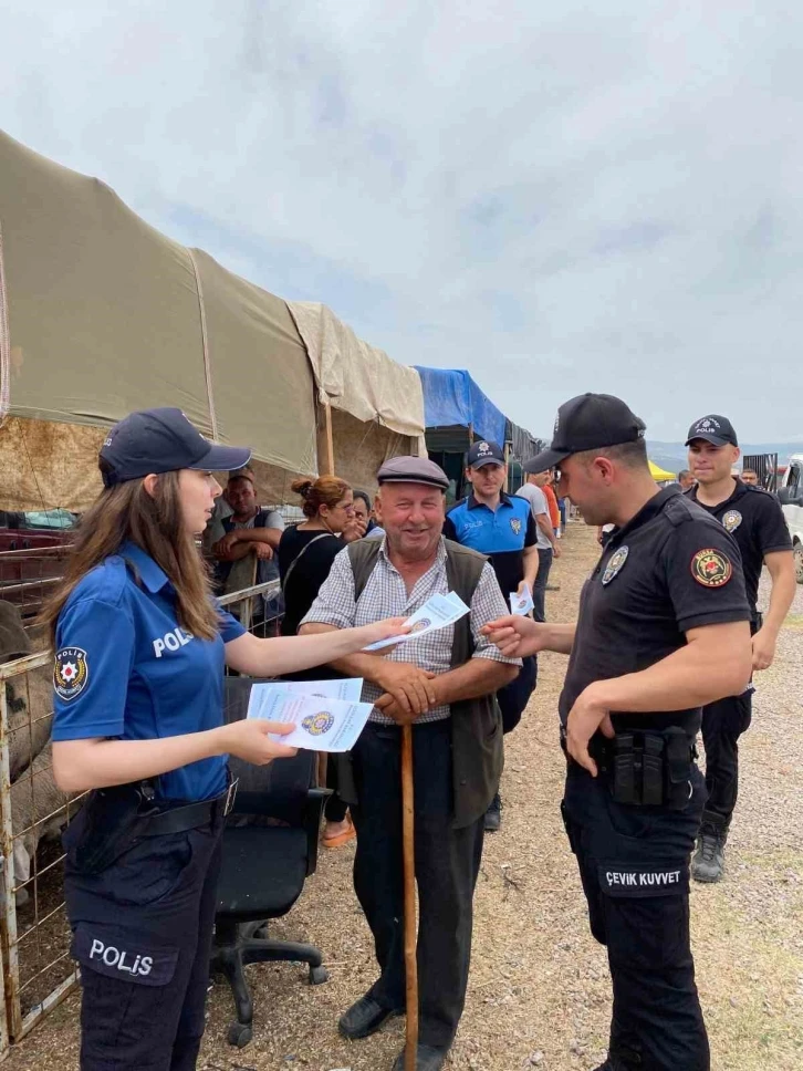 Karacabey Emniyet Müdürlüğü Asayiş Büro Amirliği ekipleri, Kurban Bayramı öncesi hayvan satışı yapılan pazara giderek esnafla buluştu. Polisler, satışa çıkardıkları hayvanlarını pazarlarken dolandırılmamaları için uyarıldı. Hırsızlık, sahte para ve tırnakçılık yöntemiyle dolandırıcılık konularında uyarılarda bulunan ekipler, esnafa Türk lirasının güvenlik özelliklerinin yer aldığı broşürler dağıttı.