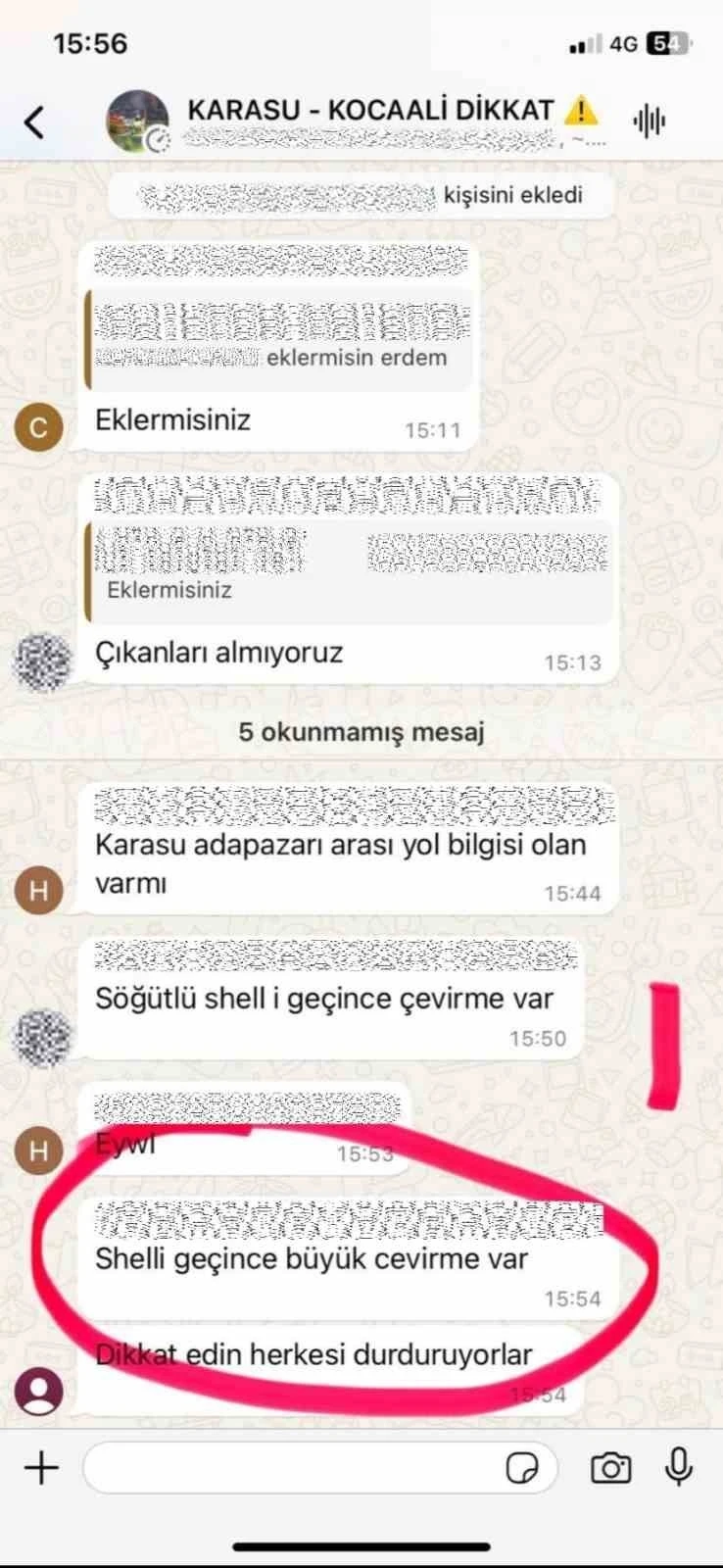 Sakarya İl Jandarma Komutanlığı ekipleri, kurulan bir WhatsApp grubunda jandarma ve polis uygulama noktalarının anlık olarak paylaşıldığı bilgisini aldı. Durumun üzerine harekete geçen ekiplerce yapılan çalışma neticesinde; 22 Şubat 2024 tarihinde kurulan WhatsApp grubunda Kocaali, Ferizli, Söğütlü ve Adapazarı ilçeleri gidiş-dönüş istikametinde D-650 kara yolu üzerinde kurulan jandarma ile polis uygulama noktalarının anlık olarak paylaşıldığını tespit edildi. 900 kişinin içerisinde bulunduğu ‘Kocaali-Karasu Dikkat’ isimli grup, jandarmanın başarılı operasyonu ile deşifre edildi. ‘Suçluyu Kayırma Suçu’ çerçevesinde başlatılan operasyonda grubun kurucusu ve yöneticisi A.E.P. (37), grubun diğer yöneticileri; E.Y. (37), İ.Ö. (35) ve H.Y. (35) isimli 4 şüpheli gözaltına alındı. Şahıslar jandarmadaki işlemlerinin ardından ‘Suçluyu Kayırma’ suçu ile sevk edildikleri mahkemede adli kontrol şartı ile serbest bırakıldı. Gruptaki 150 şahsın suç dosyası kabarık