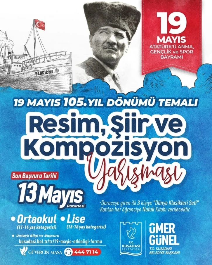 Kuşadası Belediyesi, 19 Mayıs Atatürk’ü Anma, Gençlik ve Spor Bayramının 105. yılında, ortaokul ve lise öğrencilerine yönelik “Resim, Şiir ve Kompozisyon Yarışması” düzenliyor. Dereceye giren öğrencilere dünya klasikleri seti hediye edecek olan Kuşadası Belediyesi, başvuru yapan her öğrenciye ise Nutuk hediye edecek. Kuşadası Belediyesi, Mustafa Kemal Atatürk’ün Samsun’a çıkışı ile başlayan ulusal kurtuluş mücadelesinin yıl dönümü olan 19 Mayıs Atatürk’ü Anma Gençlik ve Spor Bayramı nedeniyle 11-14 yaş kategorisini kapsayan ortaokul ve 15-18 yaş kategorisini kapsayan lise öğrencilerine yönelik bir yarışma düzenledi. “19 Mayıs’ın 105’inci Yılı” teması ile düzenlenen yarışma resim, şiir ve kompozisyon olmak üzere 3 ayrı dalda gerçekleşecek. Yarışmaya katılmak isteyen öğrenciler, eserlerini 13 Mayıs Pazartesi günü saat 17.30’a kadar Kuşadası Belediyesi Ana Hizmet Binası, Ek Hizmet Binası ile Davutlar Mahallesi Hizmet Binasının giriş katlarında hizmet vermekte olan Güvercin Masa personeline teslim edebilir. Yarışma kapsamında başvuru yapan tüm öğrencilere, 19 Mayıs’ı gençlere armağan eden Ulu Önder Mustafa Kemal Atatürk’ün ölümsüz eseri Nutuk hediye edilecek. 3 ayrı dalda ilk 3’e giren öğrenciler ise dünya klasikleri seti ile ödüllendirilecek.