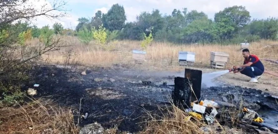 Kütahya’nın Emet ilçesinde boş arazide çıkan yangında 7 arı kovanı küle döndü.