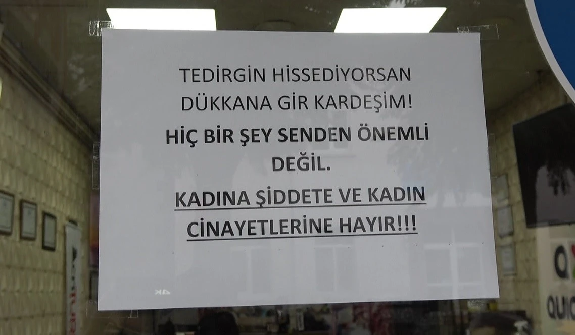 Kütahya’nın Tavşanlı ilçesinde bir esnaf, iş yerinin camına astığı yazı ile kadınların yanında olduğunu belirtti.