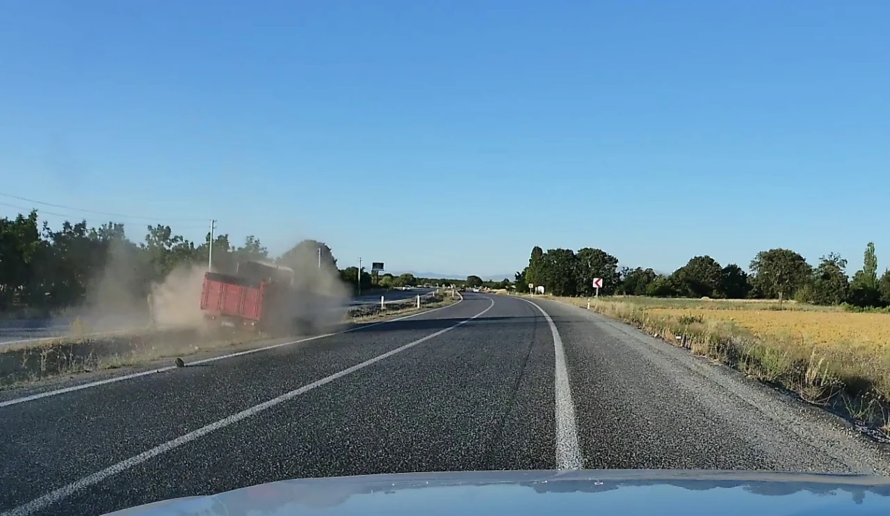 Görüntülerde, Beyşehir ilçe merkezi yönünde hareket halinde olan kamyonun lastiğinin patlamasıyla toz bulutu yükselmesi, lastik parçası, kamyonun kontrolden çıkarak karşı şeride doğru yönlendiği anlar yer alıyor. Sürücünün toz bulutlarının da yükseldiği refüjdeki trafik levhasına da çarpmadan sağa sola yalpalayan aracının hem devrilmesini önlediği hem de karşı şeride geçmesine engel olduğu, aracını ustalıkla durdurmayı başardığı görülüyor.