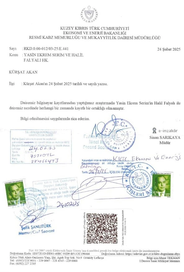 CHP Genel Başkanı Özgür Özel’in Lefkoşa Büyükelçisi Yasin Ekrem Serim’in ’Kıbrıs’ta öldürülen Halil Falyalı ile ortak şirket kurduğu’ iddialarına KKTC’de tüm şirketlerin kayıtlarının tutulduğu Ekonomi Bakanlığına bağlı Resmi Kabz Memurluğu’nca resmi belgeyle yalanlama geldi. Resmi Kabz Memurluğu tarafından yapılan açıklamada herhangi bir dönemde, hiçbir şirkette Yasin Ekrem Serim ile Halil Falyalı ortaklığının bulunmadığı kaydedildi. Yasin Ekrem Serim’in avukatından açıklama