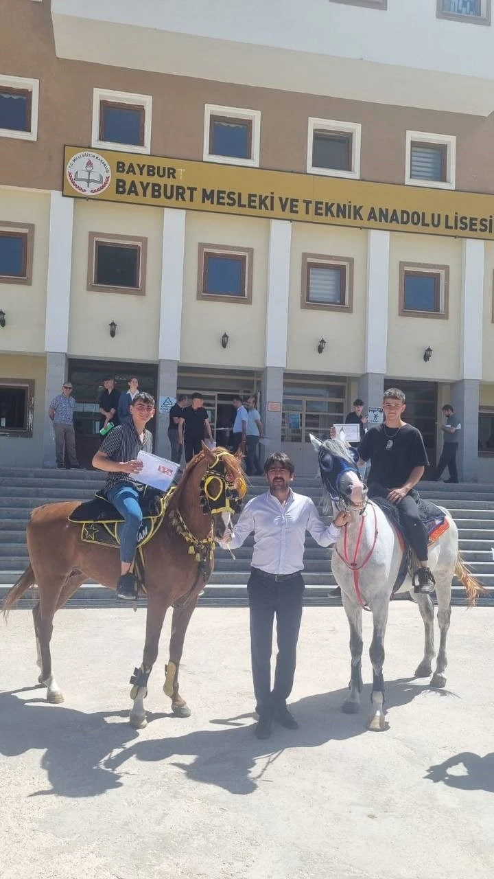 Bayburt Mesleki ve Teknik Anadolu Lisesi öğrencilerinden Emirhan Arık ve Enes Tokay isimli öğrenciler karne almak için okula atlarla gittiler. "Ehliyetim olmadığı için ben de atla geldim" diyerek olaya şakayla yaklaşan Arık, karnesini at üzerinde aldı.