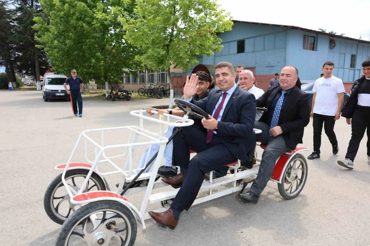 DÜZCE (İHA) – Düzce Borsa İstanbul Mesleki ve Teknik Anadolu Lisesi’nde açılan bilim fuarına katılan Vali Selçuk Aslan, öğrencilerin yaptığı bisiklete binerek dikkat çekti.