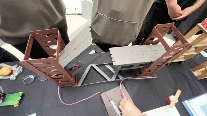 10. sınıf öğrencileri Melek Duygu ile Mehmet Furkan Köç ise hazırladıkları açılır kapanır köprü ile sergi salonundaki yerini aldı. Proje hakkında bilgi veren Melek Duygu, "Biz bu projeyi tasarlarken Türkiye’de ve diğer ülkelere yaşanan sorunu baz aldık. Deniz ulaşımı sırasında büyük yükler taşıyan gemiler, sabit köprülerden dolayı boğazlardan geçemiyor ve yollarını uzatmak zorunda kalıyor. Bu da hem zaman hem de maliyet açısından insanlara yük oluyor. ’Bu sorunu düzeltmek için neler yapabiliriz?’ diye düşündük ve iki çözüm yolu bulduk. Birincisi bizim yaptığımız hidrolik köprü, ikincisi ise asansörlü sistem" diye konuştu. "Bu hidrolik köprü hem maliyet hem de zaman açısından fayda sağlıyor"
