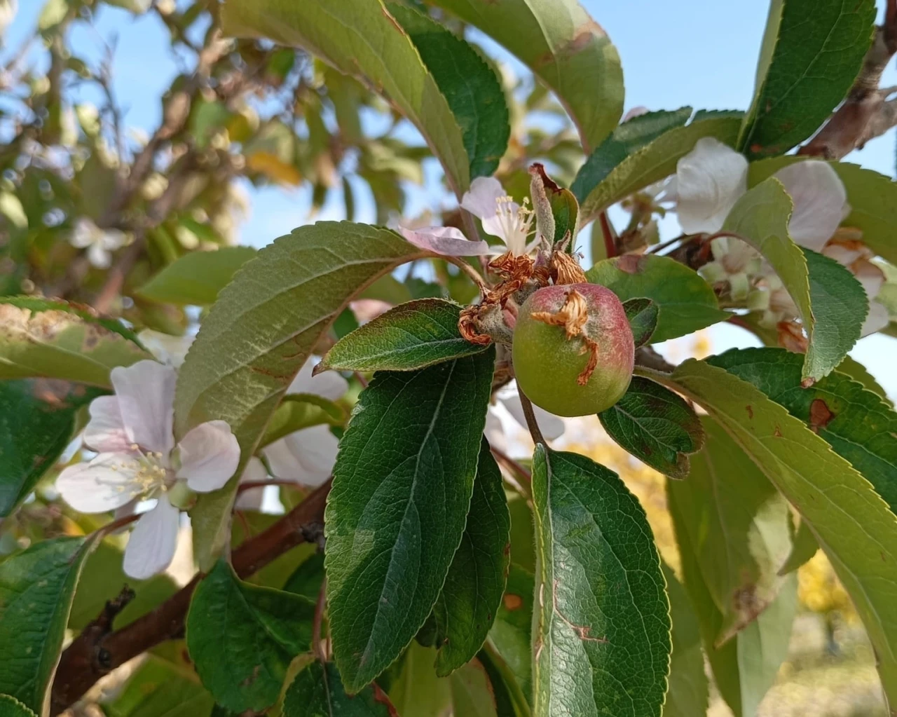 Malatya’nın Yazıhan ilçesinde bir elma ağacının kış aylarına sayılı günler kala çiçek açıp meyve vermesi görenleri şaşırttı.