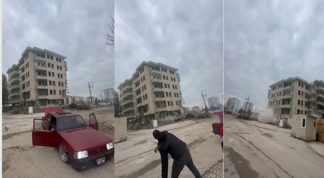 Bir araçtan yüksek sesle müzik açılırken, bir taraftan da kepçe operatörü uzak bir noktadan yere vurmaya başladı. Aynı zamanda bir çalışanın da binaya taş attığı ve yine bir aracın kornaya bastığı bu anlarda yapılan sıradışı müdahaleler sonucunda, yıkım anı daha da hızlandı ve bina, kısa süre sonra tamamen çöktü.
