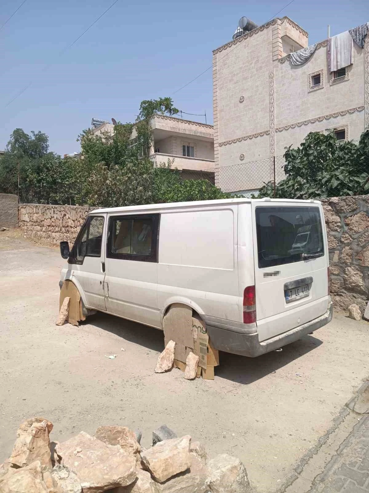 Mardin’in Midyat ilçesinde bir sürücü, minibüsün tekerlerini aşırıcı sıcaktan korumak için kartonla kapattı.