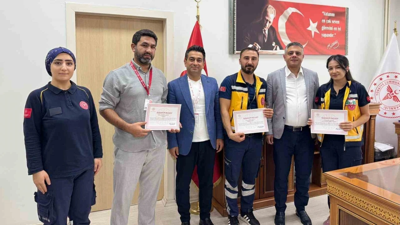 Mardin’in Artuklu ilçesinde görev dönüşü çıkan yangına müdahale ederek büyümesini önleyen sağlık çalışanları ödüllendirildi.