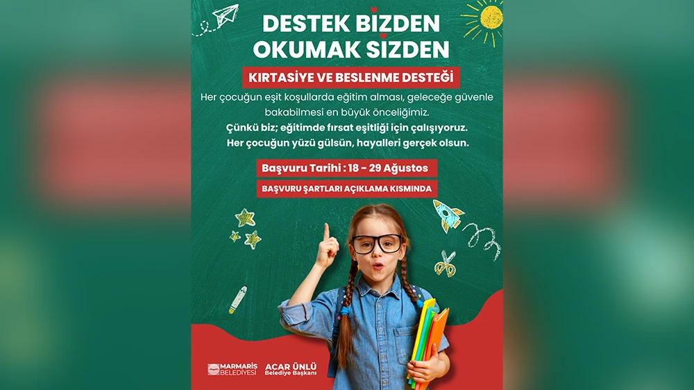 Marmaris Belediyesi, her yıl olduğu gibi bu yıl da ihtiyaç sahibi ailelerin çocuklarına eğitimde fırsat eşitliği sunmak amacıyla kapsamlı bir destek programı başlattı. "Destek Bizden, Okumak Sizden" sloganıyla duyurulan kampanya, ailelerin en temel ihtiyaçlarından olan kırtasiye ve beslenme giderlerini karşılıyor. Bu sayede çocukların okula daha güvenle ve eksiksiz bir şekilde başlaması hedefleniyor.
