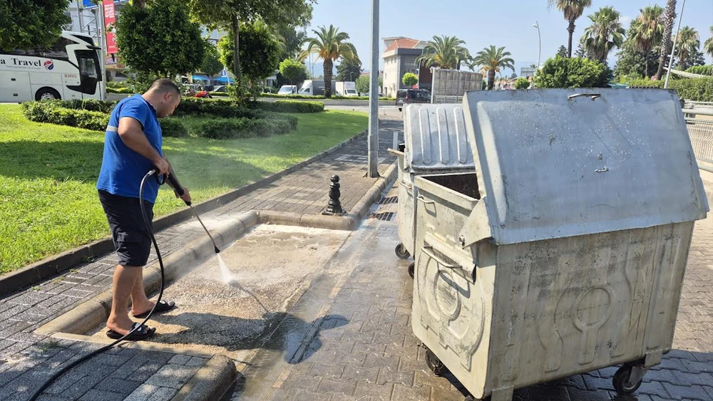 Marmaris Belediyesi temizlik ekipleri, sıcaklık nedeniyle oluşabilecek kötü kokular ve hijyen sıkıntısı yaşanmaması için çöp konteynerlerinin temizliğine ağırlık veriyor.