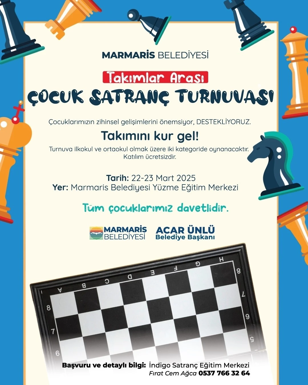 Marmaris Belediyesi 22-23 Mart tarihleri arasında satranç turnuvası düzenliyor. Takımlar halinde yapılacak turnuvaya başvurular başladı. Marmaris Belediyesi, ilçedeki satranç eğitim merkezi işbirliğiyle satranç turnuvası düzenliyor. İlkokul ve ortaokul kategorilerinde takımlar halinde yapılacak turnuvanın başvuruları başladı. 22-23 Mart tarihlerinde yapılacak turnuvanın finali ve ödül töreni ise 23 Mart Pazar günü gerçekleştirilecek. Yarışmada her takım dört sporcudan oluşup, sporcular okulu adına yarışabileceği gibi kulüp adına ya da kendi takımlarını kurarak da yarışmaya katılabilecek. Ücretsiz katılımın olacağı turnuvaya www.mugla.tsf.org.tr adresinden online kayıt yapılabilecek. Katılmak isteyenler satranç eğitim merkezinin 0537 766 32 64 numaralı telefonunu arayarak bilgi alabilecek. "Belediye olarak spora ve sporcuya olan desteğimiz sürecek" diyen Marmaris Belediye Başkanı Acar Ünlü, "Satranç gibi tamamen akla ve bilime dayalı bir sporun yaygınlaşmasını önemsiyoruz. Bu nedenle bu turnuvayı düzenledik. Bu spora gönül veren öğrencilerimizi heyecan dolu bir mücadele için turnuvaya davet ediyorum" ifadelerini kullandı.