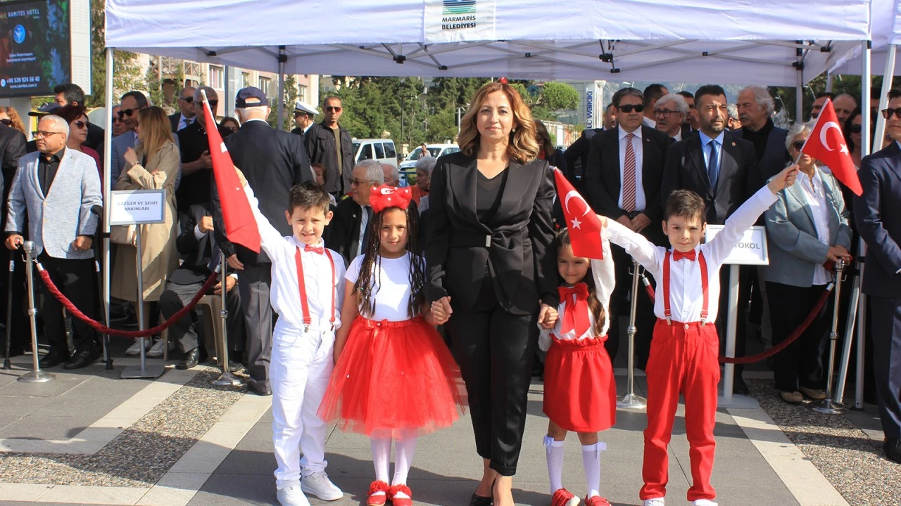 Marmaris Atatürk Meydanı’nda gerçekleşen törende, İlçe Milli Eğitim Müdürü Serap Aksel minik öğrenciler ve öğretmenlerle birlikte Milli Eğitim Müdürlüğü çelengini Atatürk Anıtı’na sundu.