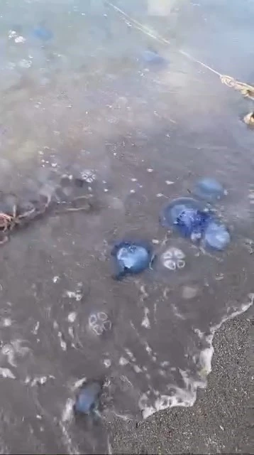 Bursa’nın Gemlik ilçesi sahilini saran mavi renkli denizanaları vatandaşları tedirgin etti.