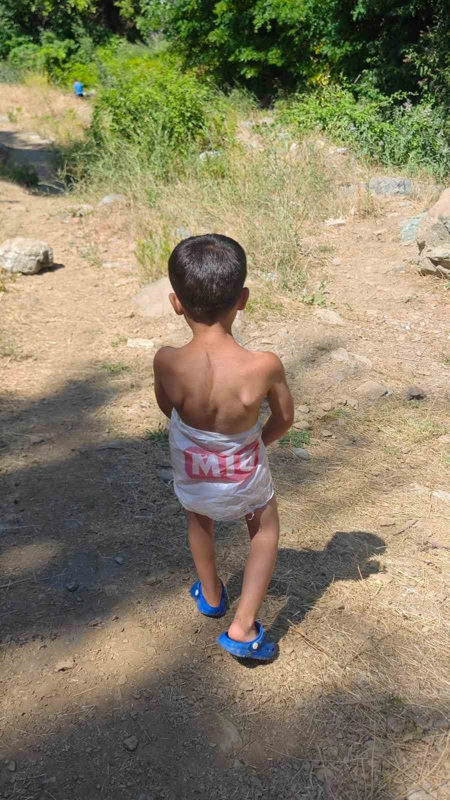 Elazığ’ın Palu ilçesinde sıcak havalardan bunalan bir çocuk, mayosu olmadığı için market poşetinden mayo yapıp suda serinledi.