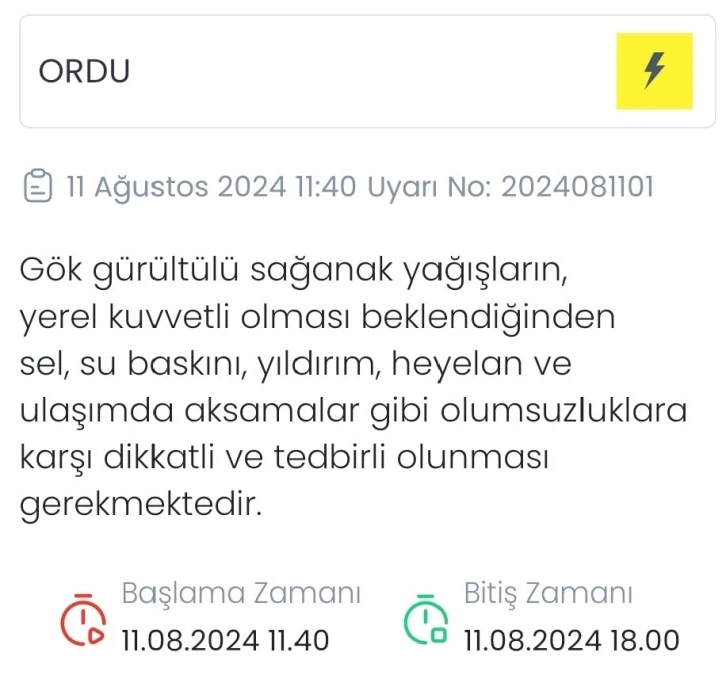 Meteoroloji Genel Müdürlüğünden yapılan uyarıda, 11 Ağustos öğlen saatlerinden itibaren etkili olacak yağışların, aynı günün akşam saatlerine kadar etkili olacağı bildirildi. Aşırı yağışlara karşı dikkatli olunması gerektiğine dikkat çekilen uyarıda, “Gök gürültülü sağanak yağışların, yerel kuvvetli olması beklendiğinden sel, su baskını, yıldırım, heyelan ve ulaşımda aksamalar gibi olumsuzluklara karşı dikkatli ve tedbirli olunması gerekmektedir" denildi.