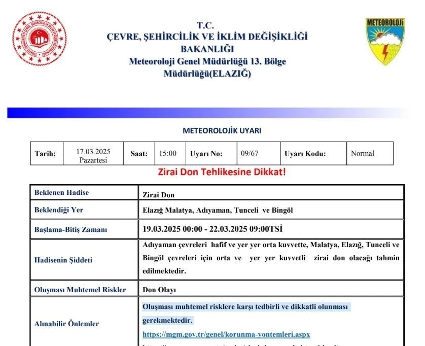 Meteoroloji 13. Bölge Müdürlüğü’nden yapılan açıklamada, "Elazığ, Malatya, Adıyaman, Tunceli ve Bingöl için 19.03.2025 - 22.03.2025 tarihleri arasından zirai don hadisesi beklenmektedir. Adıyaman çevreleri hafif ve yer yer orta kuvvette, Malatya, Elazığ, Tunceli ve Bingöl çevreleri için orta ve yer yer kuvvetli zirai don olacağı tahmin edilmektedir. Oluşması muhtemel risklere karşı tedbirli ve dikkatli olunması gerekmektedir" denildi.