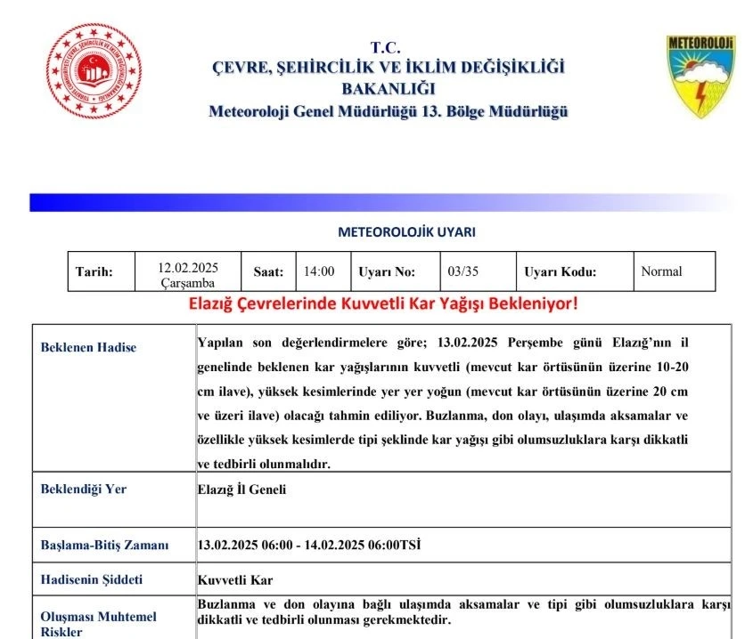Meteoroloji 13. Bölge Müdürlüğü’nden yapılan açıklamada, "Yapılan son değerlendirmelere göre; 13.02.2025 Perşembe günü Elazığ’ın il genelinde beklenen kar yağışlarının kuvvetli (mevcut kar örtüsünün üzerine 10-20 cm ilave), yüksek kesimlerinde yer yer yoğun (mevcut kar örtüsünün üzerine 20 cm ve üzeri ilave) olacağı tahmin ediliyor. Buzlanma, don olayı, ulaşımda aksamalar ve özellikle yüksek kesimlerde tipi şeklinde kar yağışı gibi olumsuzluklara karşı dikkatli ve tedbirli olunmalıdır. Buzlanma ve don olayına bağlı ulaşımda aksamalar ve tipi gibi olumsuzluklara karşı dikkatli ve tedbirli olunması gerekmektedir. Oluşması muhtemel risklere karşı tedbirli ve dikkatli olunması gerekmektedir" denildi.
