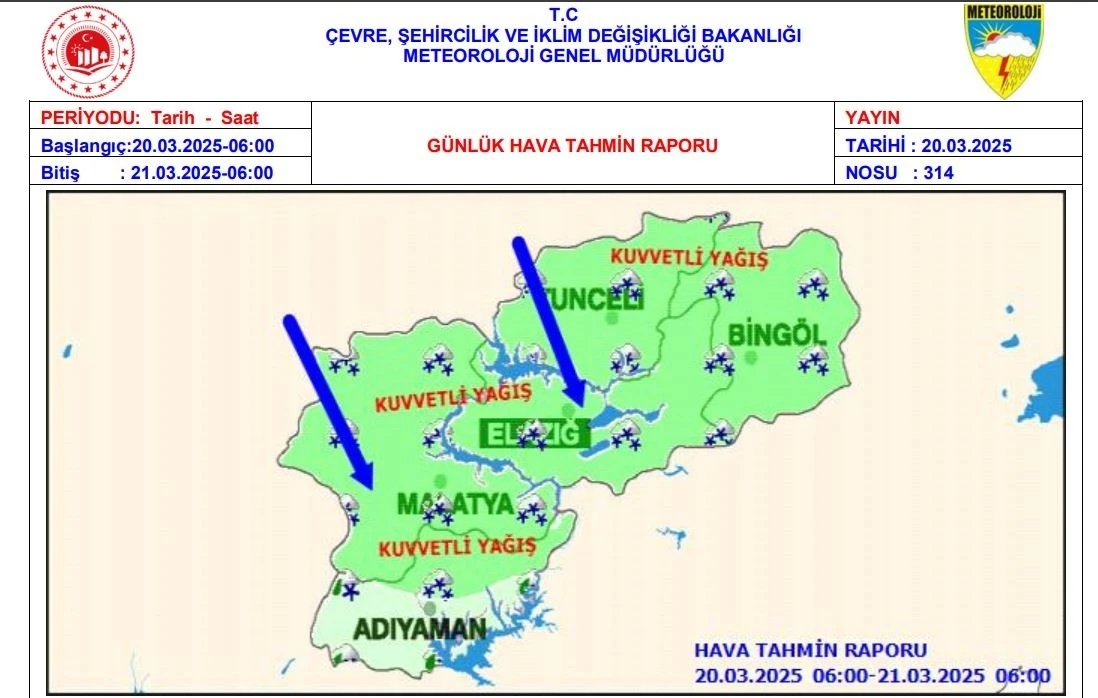 Meteoroloji 13. Bölge Müdürlüğü’nden yapılan açıklamada, "Yapılan son değerlendirmelere göre bölge genelinde havanın çok bulutlu, aralıklı yağışlı olarak geçeceği, yağışların karla karışık yağmur ve kar yağışı şeklinde olacağı tahmin edilmektedir. Yağışların Elazığ, Bingöl, Tunceli ve Malatya çevreleri ile Adıyaman’ın kuzey kesimlerinde yer yer kuvvetli olması beklenmektedir. Hava sıcaklıklarının mevsim normallerinin 8 ila 10 derece altında seyredeceği tahmin edilmektedir" denildi. Yapılar uyarılarda ise "Beklenen yağışların karla karışık yağmur, kuvvetli (10-20 cm) ve yer yer yoğun kar yağışı şeklinde olacağı tahmin edildiğinden yaşanabilecek sel, su baskını, buzlanma ve don olayı, tipi gibi olumsuzluklara karşı dikkatli ve tedbirli olunması önem arz etmektedir. Beklenen yağışların karla karışık yağmur, kuvvetli (10-20 cm) ve yer yer yoğun kar yağışı şeklinde olacağı tahmin edildiğinden yaşanabilecek sel, su baskını, buzlanma ve don olayı, tipi gibi olumsuzluklara karşı dikkatli ve tedbirli olunması önem arz etmektedir. Yüksek kar örtüsüne sahip eğimli yamaçlarında çığ tehlikesi bulunduğundan heyelan, ulaşımda aksamalar ve kar erimesine bağlı olumsuzluklara karşı ilgililerin ve vatandaşlarımızın dikkatli ve tedbirli olmaları gerekmektedir" ifadelerine yer verildi.